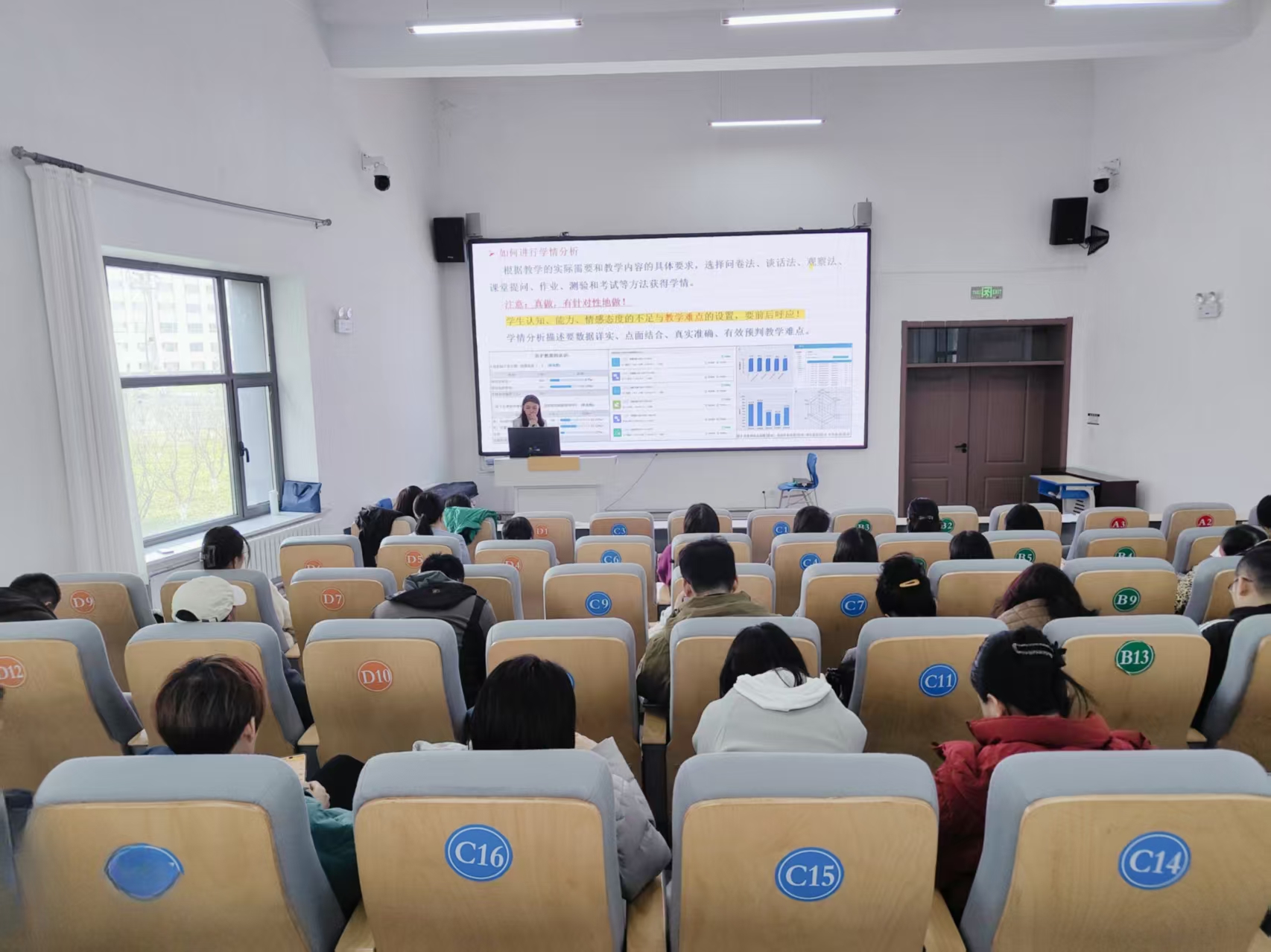 最后,基础教学部田梦瑶老师以《教学能力比赛专项培训汇报——教学设计》为题分享经验。她带领在场教师回归课堂本质,围绕“以学生为中心”的教学设计核心,深入讲解从“教学脚本构思”到 “课堂动态生成”的实践智慧。田梦瑶老师重点阐述了如何设计一堂既能激发学生学习兴趣、精准达成教学目标,又能预留动态生成空间的优质课,从学情分析、目标设定、活动设计到评价反馈,提供了完整的实操思路。尤其在学情分析环节,她强调需根据教学需求与内容特点,灵活运用问卷法、谈话法、观察法、课堂提问、作业测验等方式获取真实数据,确保学情分析“数据详实、点面结合、真实准确”,并与教学难点设置形成“前后呼应”,为年轻教师快速成长提供了切实有效的指导。