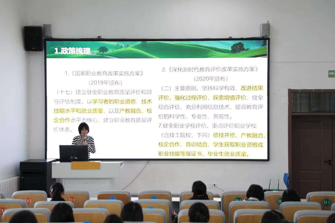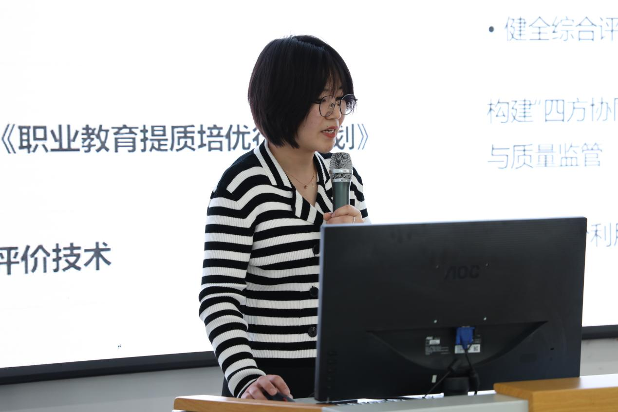 会议由小学教育系党支部书记张艺莹老师主持。刚刚在国赛取得佳绩的孟庆颜老师,作为本次分享活动的主讲人。孟老师以《学而致知 行而致远》为题,聚焦基于数字技术的教学评价体系构建及中职公共基础课教师教学设计,将国培所学与国赛感悟做了精彩的汇报分享。她围绕数字技术赋能教学评价,结合国培期间的系统学习,从教学评价改革的政策梳理、传统教学评价的痛点、数据驱动的教学评价体系的构建、数字化教学评价的案例分析等方面,让老师们直观感受如何利用数字技术实现评价的精准化、过程化与个性化。
