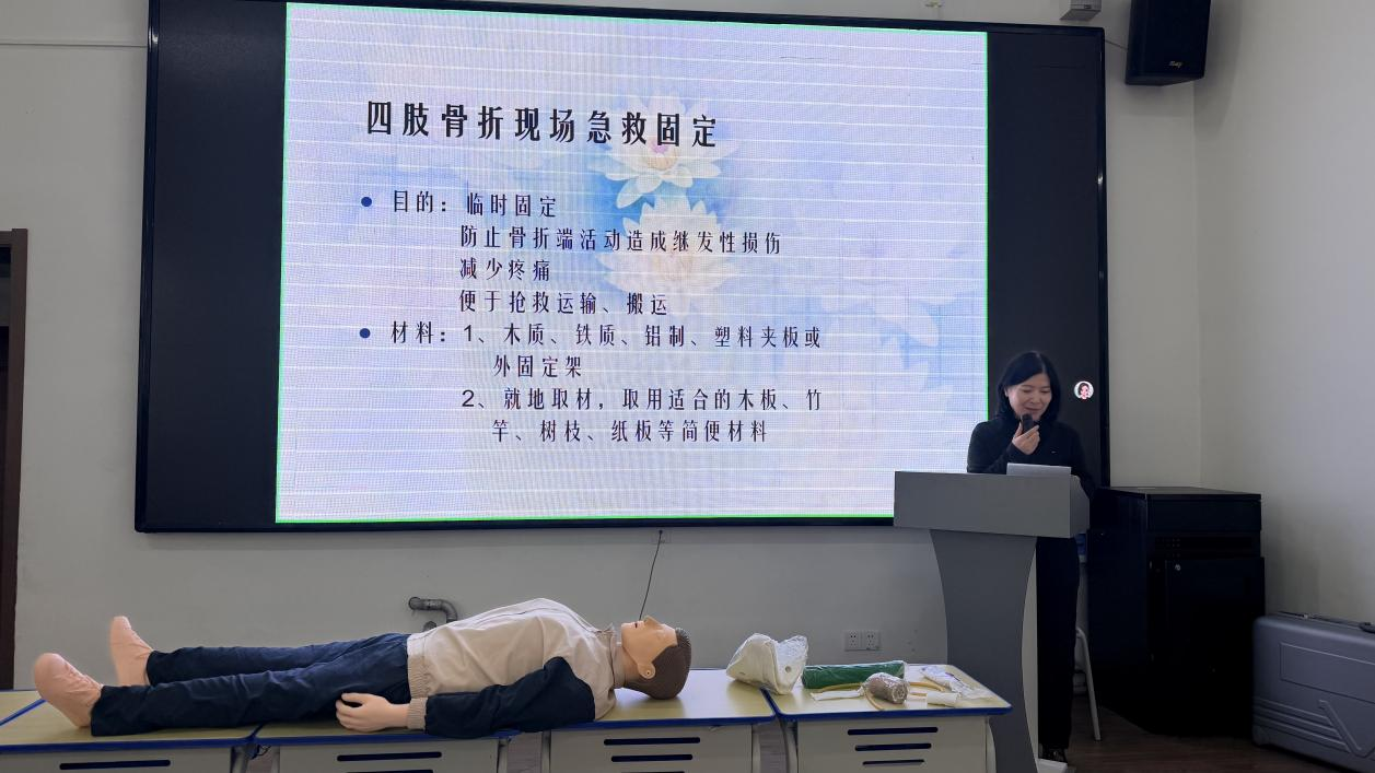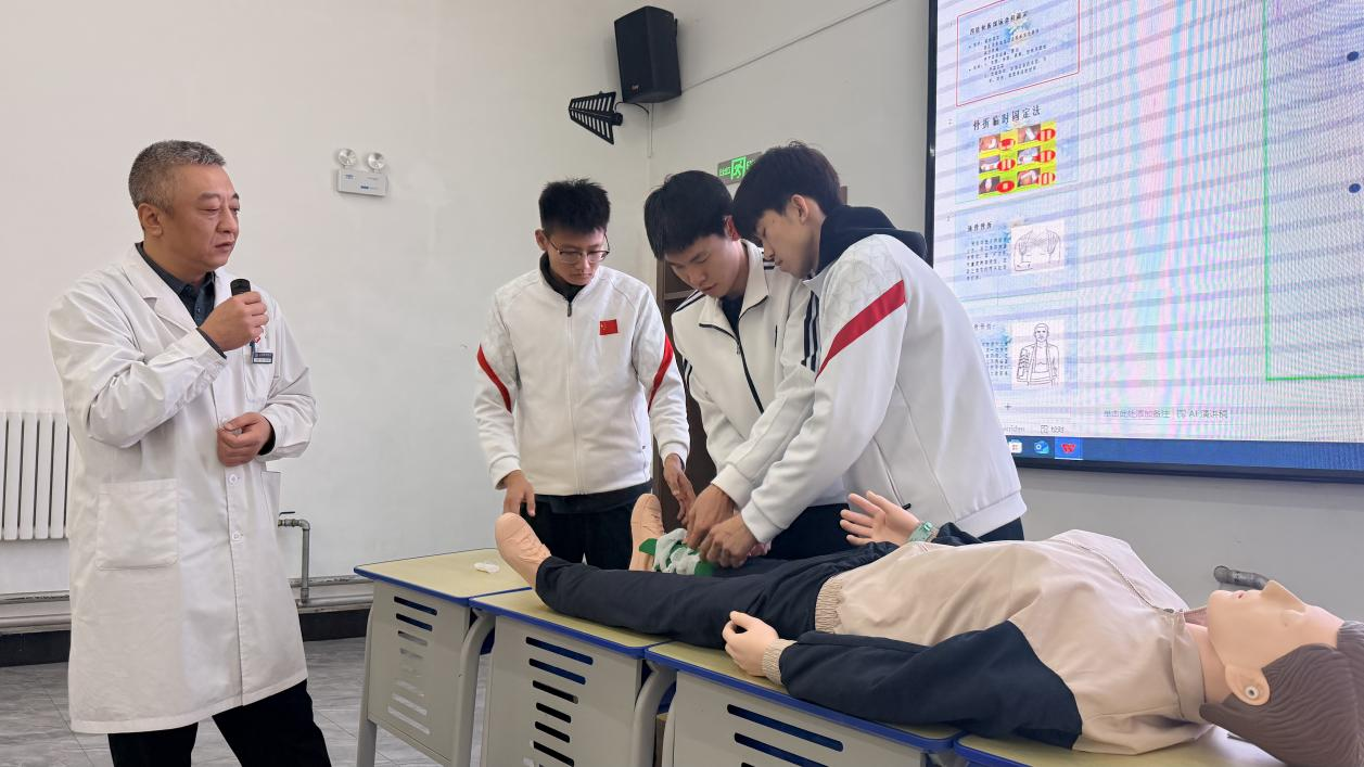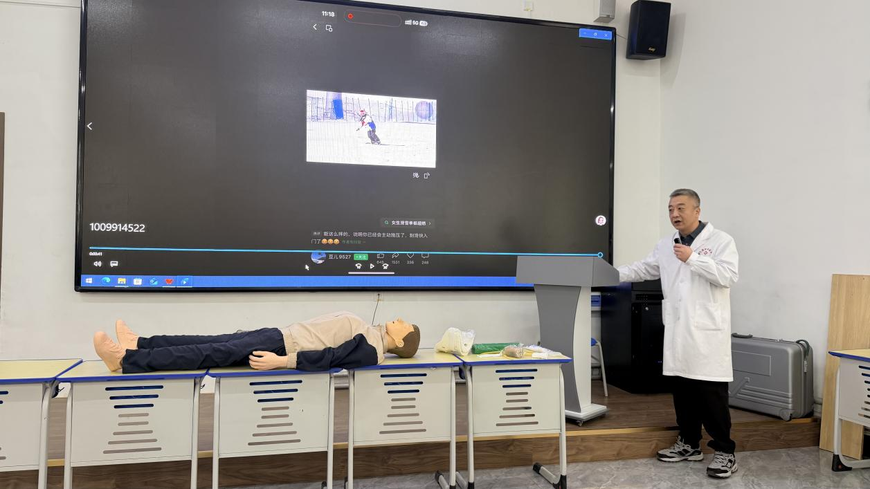 辽源市中医院骨伤科副主任王晨阳教授拥有25年骨科临床经验,他以“脊柱及四肢骨折的现场急救”为主题,系统讲解了从伤情判断、临时固定到安全搬运的全流程要点。王晨阳教授结合大量实例,将专业医学知识转化为易懂可操作的动作要领,强调了避免二次损伤的核心原则,为同学们筑起了应对运动损伤的第一道知识屏障。
