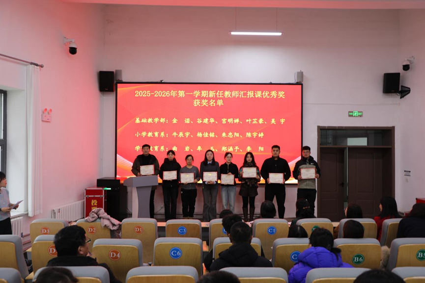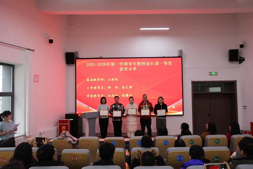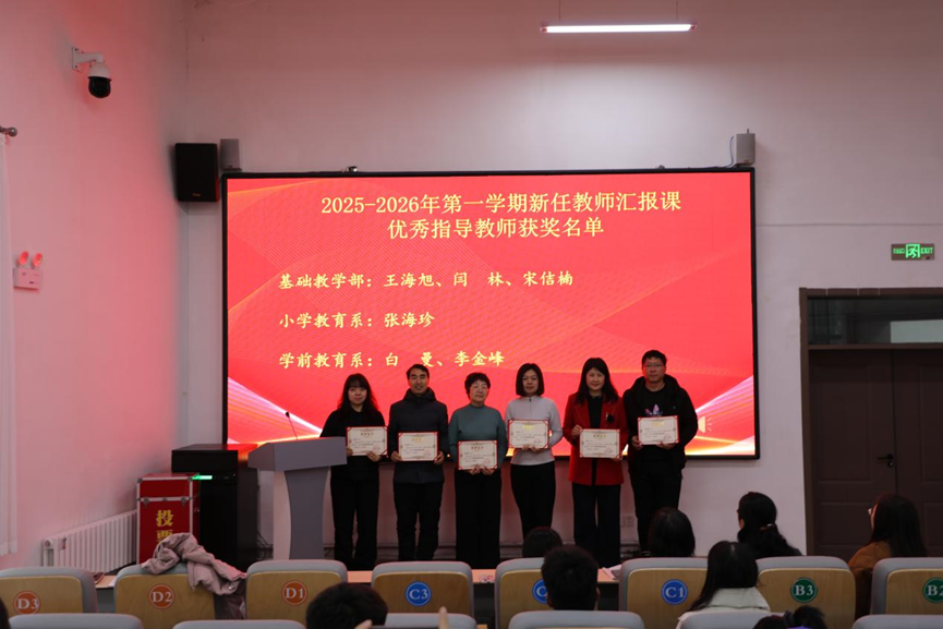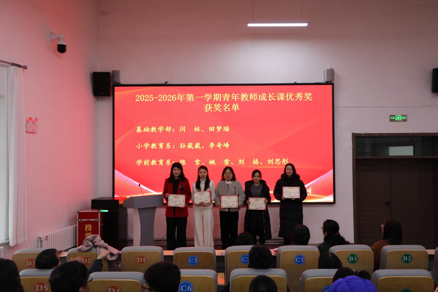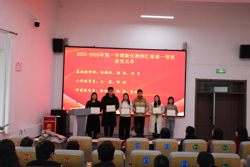 表彰环节中,小学教育系主任刘绘锋、学前教育系党支部书记段秀苓、基础教学部主任李俊华分别宣读新任教师汇报课、青年教师成长课获奖名单及优秀指导教师名单,并为获奖教师颁发荣誉。